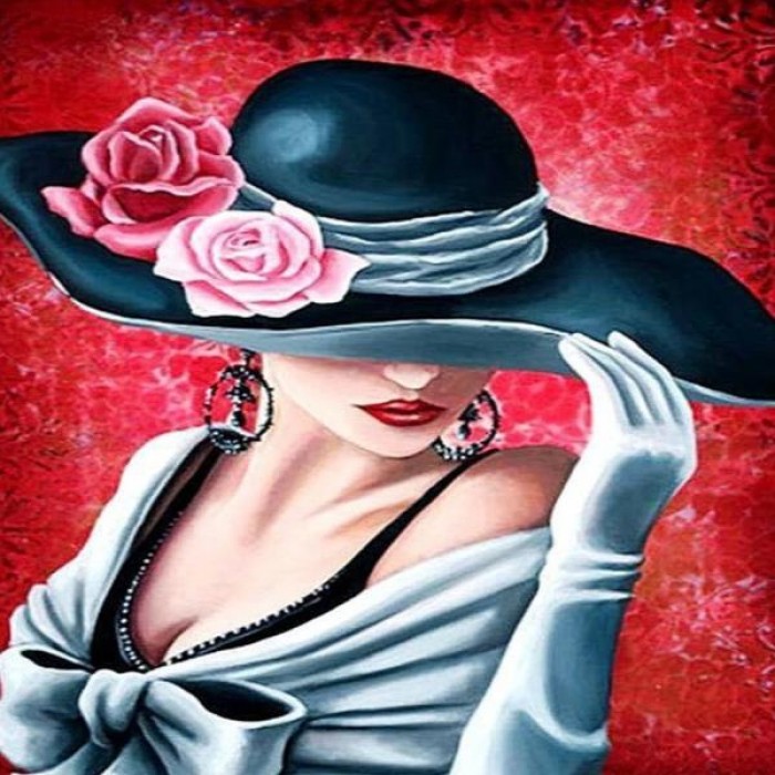 Hat with a large brim and roses gives a mysterious look for this beautiful lady. Choose from several sizes: get more details with bigger sizes or choose a smaller size if you’re a beginner.