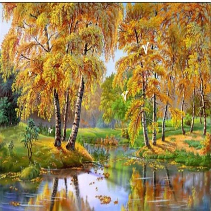 Autumn has colored birch trees bright yellow by the waterfront. Choose from several sizes: get more details with bigger sizes or choose a smaller size if you’re a beginner.
