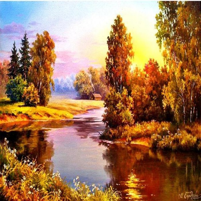 Calm river flows through the early autumn landscape. The sunset tints the air with golden hew. Choose from several sizes: get more details with bigger sizes or choose a smaller size if you’re a beginner.