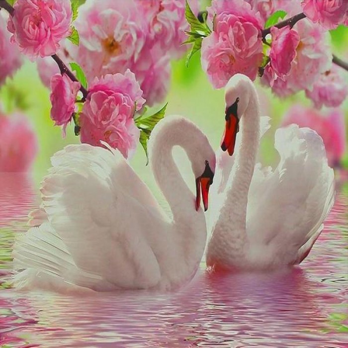 Delicate and a romantic view of swans under the pink flowers. Choose from several sizes: get more details with bigger sizes or choose a smaller size if you’re a beginner.
