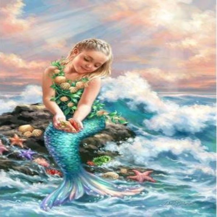Little mermaid sits on a rock admiring a seashell that she found from the ocean. Choose from several sizes: get more details with bigger sizes or choose a smaller size if you’re a beginner.