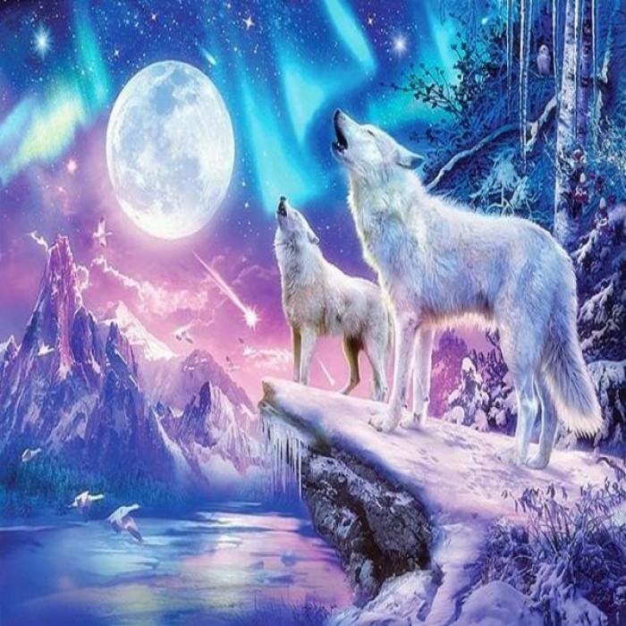 Couple of wolves inspired to howl with the air full of magic. It's a gorgeous winter night with the bright full moon and the northern lights. Choose from several sizes: get more details with bigger sizes or choose a smaller size if you’re a beginner.