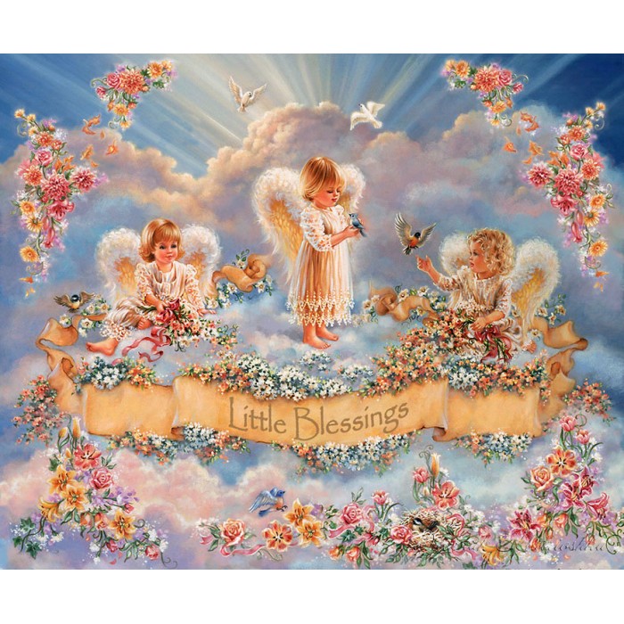 Little BlessingsCute little angels have their own place to hang out in the clouds with plenty of lovely flowers around them. Choose from several sizes..