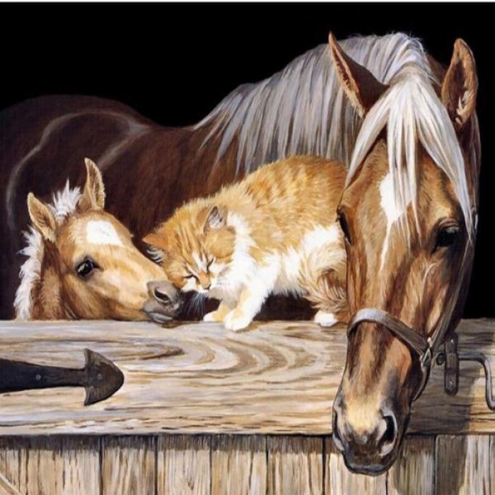 Stable cat just befriended her old friends new foal. Choose from several sizes: get more details with bigger sizes or choose a smaller size if you’re a beginner.