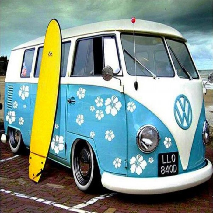 Nostalgic view of a surfer packing his surfboard to a light blue Kleinbus and heading straight to the beach. Choose from several sizes: get more details with bigger sizes or choose a smaller size if you’re a beginner.