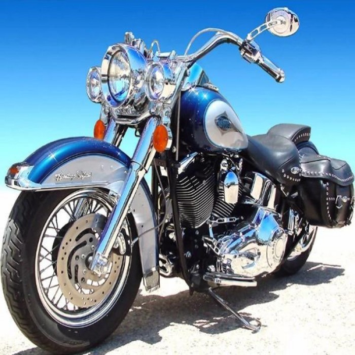 Gorgeous custom style motorbike is as beautiful bright blue as the sky above it. Choose from several sizes: get more details with bigger sizes or choose a smaller size if you’re a beginner.