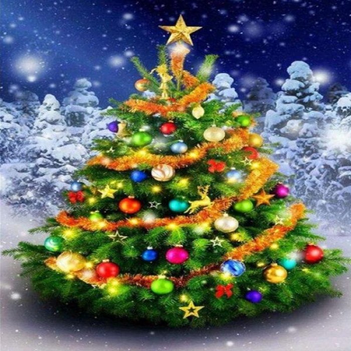 Beautifully decorated Christmas tree is ready for this year's celebration and shines brightly in the middle of snowy landscape. Choose from several sizes: get more details with bigger sizes or choose a smaller size if you’re a beginner.