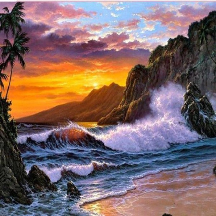 Waves hit to the rocks on the tropical beach and the sun is setting behind the cliff. Choose from several sizes: get more details with bigger sizes or choose a smaller size if you’re a beginner.