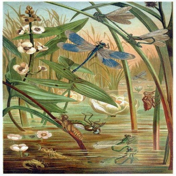 Pond scene with dragonflies in different stages of their lifecycle. Choose from several sizes: get more details with bigger sizes or choose a smaller size if you’re a beginner.
