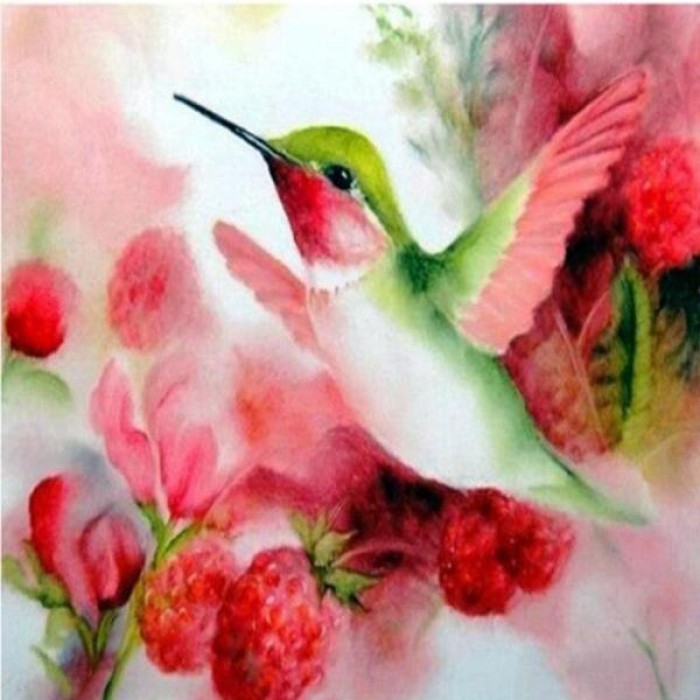 Beautiful pastel colored picture of a delicate hummingbird flying amongst the juicy raspberries – hummingbirds always amaze us with their small size! Choose from several sizes: get more details with bigger sizes or choose a smaller size if you’re a beginner.