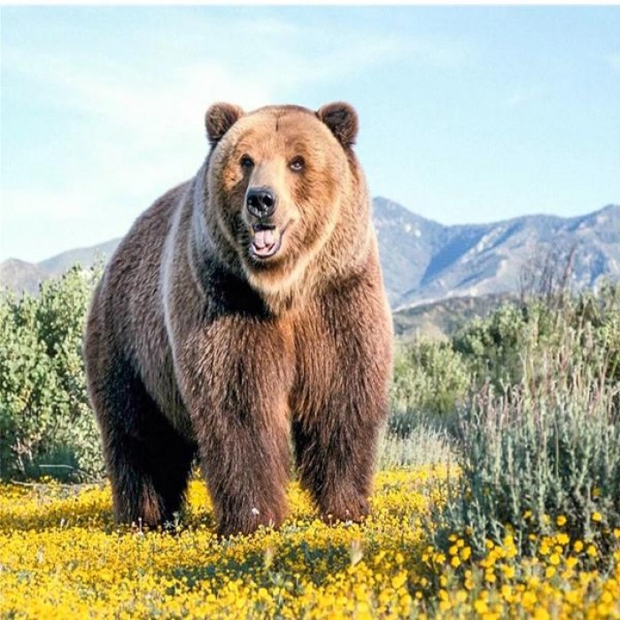 Huge grizzly bear wanders around the flowery field by the mountains. It's a beautiful sunny day and the bear has all the time in the world to enjoy it. Choose from several sizes: get more details with bigger sizes or choose a smaller size if you’re a beginner.