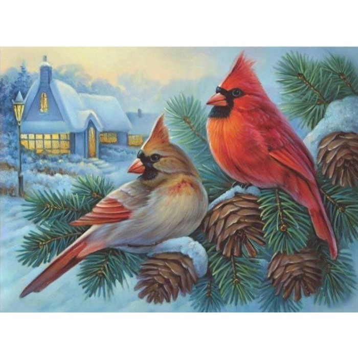 Couple of lovely cardinal birds enjoy the winter day sitting on a pine tree. Choose from several sizes: get more details with bigger sizes or choose a smaller size if you’re a beginner.