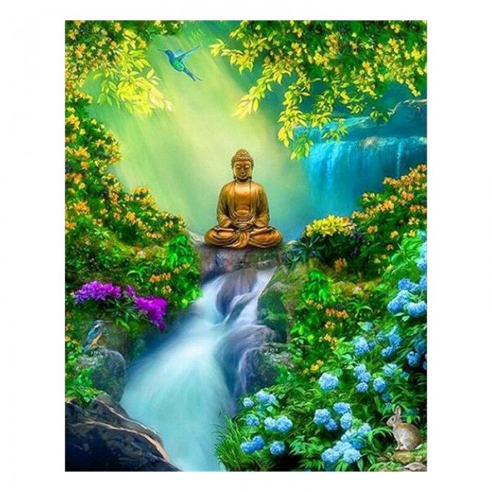 Golden Buddha sits on top of the beautiful waterfall flowing through the peaceful garden. Choose from several sizes: get more details with bigger sizes or choose a smaller size if you’re a beginner.