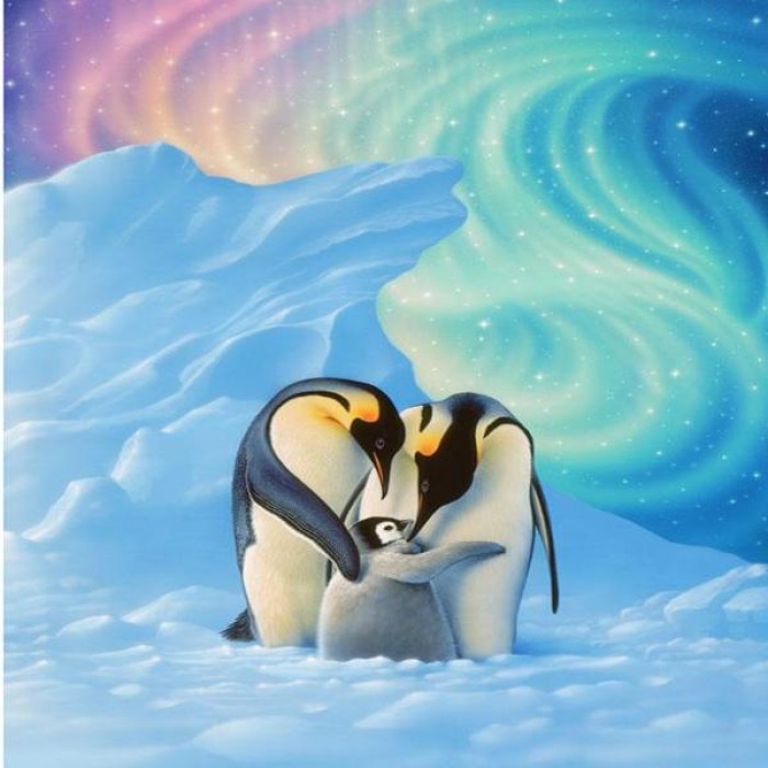 Freezing air of the Antarctica swirls around the northern lights in the sky. Loving penguin parents stay close to each other and their little chick to keep her warm. Choose from several sizes: get more details with bigger sizes or choose a smaller size if you’re a beginner.