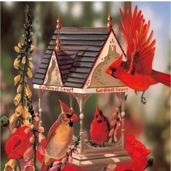 Beautiful bright red cardinals gathers together at the bird house – it's a proper cardinal court! Choose from several sizes: get more details with bigger sizes or choose a smaller size if you’re a beginner.