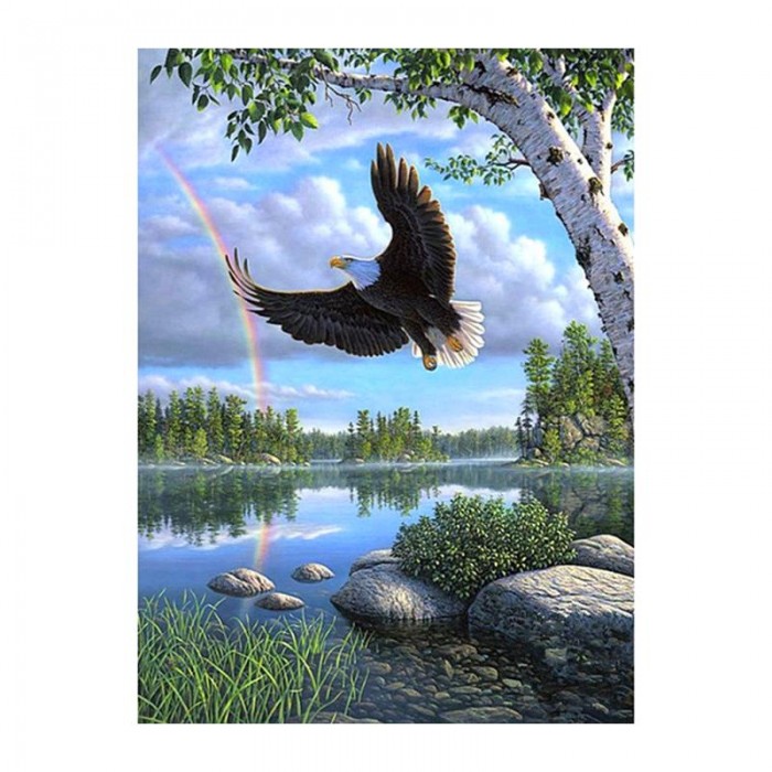 Rain clouds are clearing out of the rainbow's way and majestic eagle rose in the air planning to catch some fish from the lake. Choose from several sizes: get more details with bigger sizes or choose a smaller size if you’re a beginner.