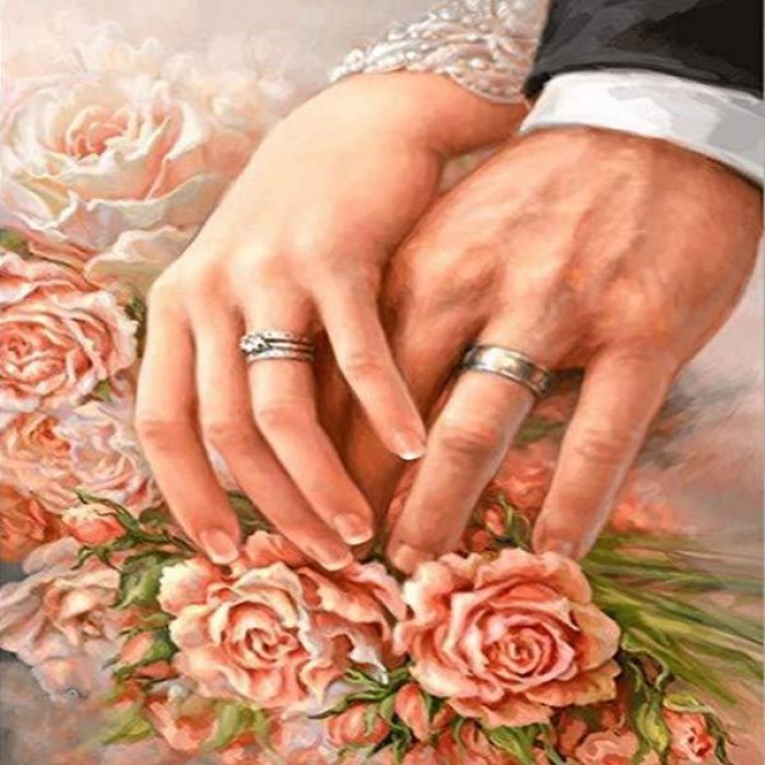 Newlywed couple holding hands on top of the roses. Beautiful diamond painting for the memory of your own wedding or make it as a gift. Choose from several sizes: get more details with bigger sizes or choose a smaller size if you’re a beginner.