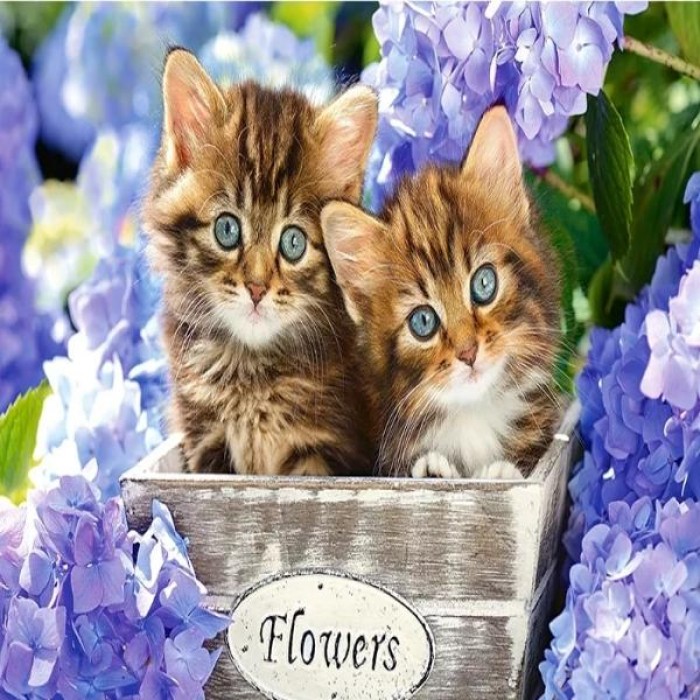 Two cute kittens sit in the flowerpot with lovely flowers around them. Choose from several sizes: get more details with bigger sizes or choose a smaller size if you’re a beginner.