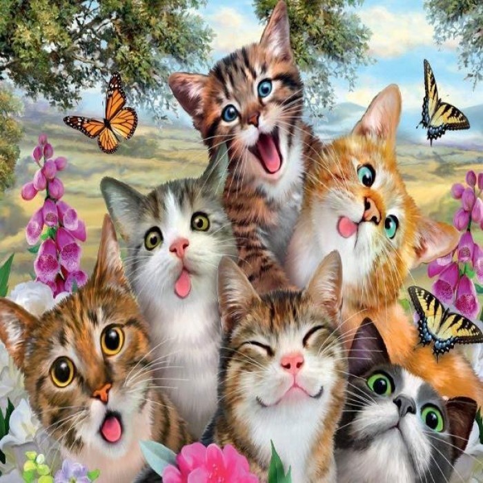 It's selfie time! Six cats are having a good time with each other and commemorate it as a picture. Choose from several sizes: get more details with bigger sizes or choose a smaller size if you’re a beginner.