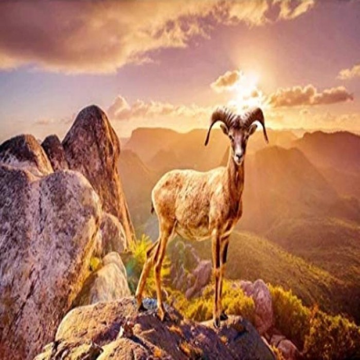 Sun is setting behind the mountains and colors the view where mountain goat lives. Choose from several sizes: get more details with bigger sizes or choose a smaller size if you’re a beginner.
