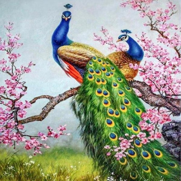 Gorgeous picture of two beautiful peacocks sitting on a flowering cherry tree. Choose from several sizes: get more details with bigger sizes or choose a smaller size if you’re a beginner.