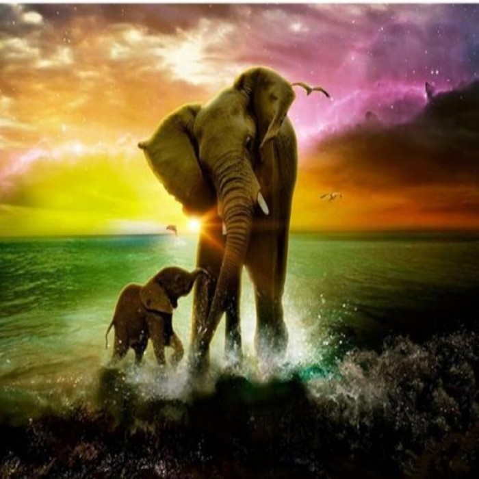 Little elephant is on the evening beach playing with his mother. Another day is ending and the sun is setting behind the skyline. Choose from several sizes: get more details with bigger sizes or choose a smaller size if you’re a beginner.
